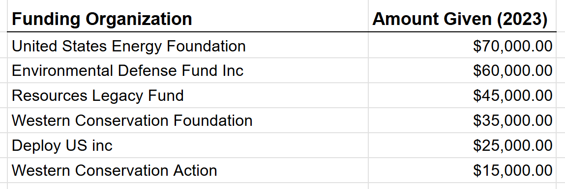Conservatives for Responsible Stewardship does not disclose its funders. However, through publicly available data filed by other organizations, we were able to discover some of their largest donors. In 2023, Conservatives for Responsible Stewardship was almost exclusively funded by liberal NGOs, receiving 96% of its $260,424 gross revenue from left wing groups including dark money heavyweights like the United States Energy Foundation, Environmental Defense Fund and Western Conservation Foundation/Action.