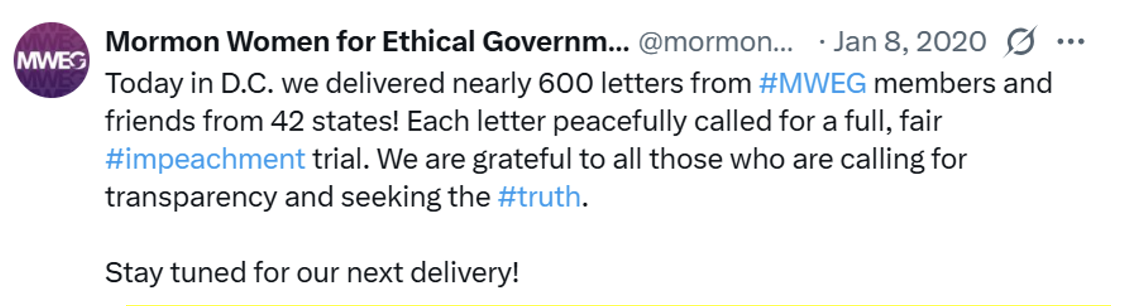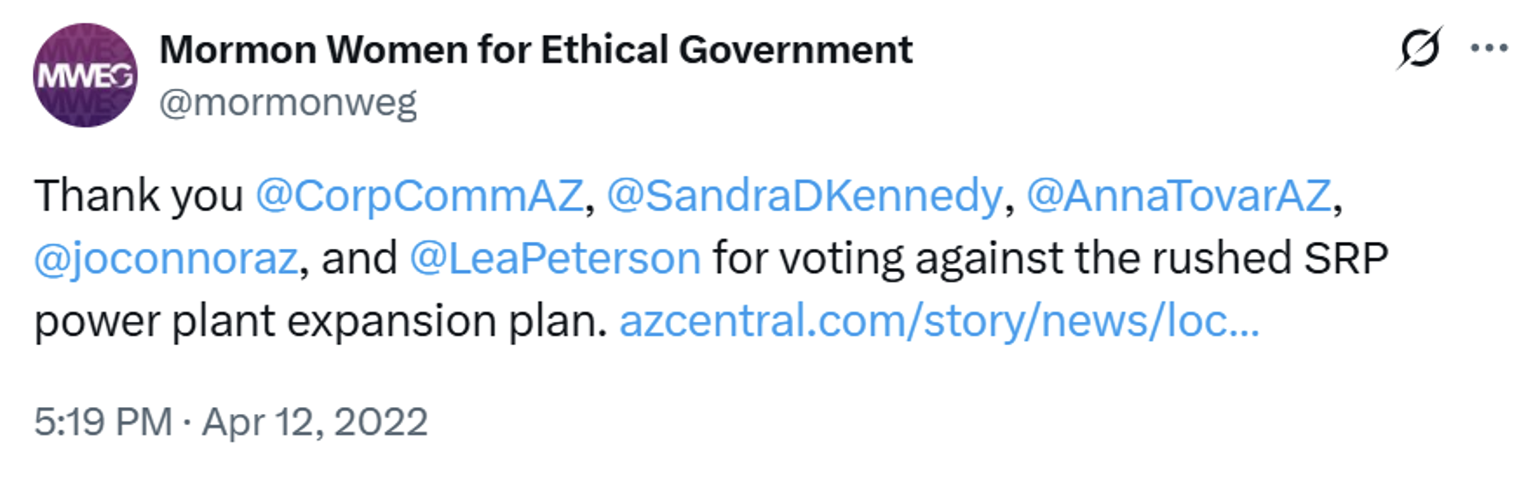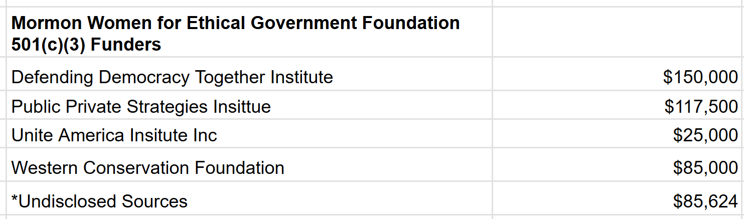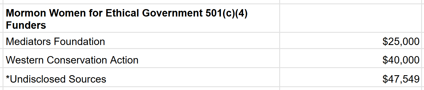 Founded in 2017, Mormon Women for Ethical Government (MWEG) have a state mission statement “To inspire women of faith to be ambassadors of peace who transcend partisanship and courageously advocate for ethical government.” Their website discusses supporting and empowering women, or voters generally, to have respectful civic engagement in their communities. However the site makes no mention of an environmental agenda. Which is surprising considering over 25% of their funding comes from environmental groups. Mormon Women for Ethical Government (MWEG) is a 501(c)(4) ‘social welfare’ organization with an affiliated 501(c)(3) charitable organization called The MWEG Foundation. Their website does not go into detail about the different activities of each group. Learn more about their funding and advocacy efforts below.