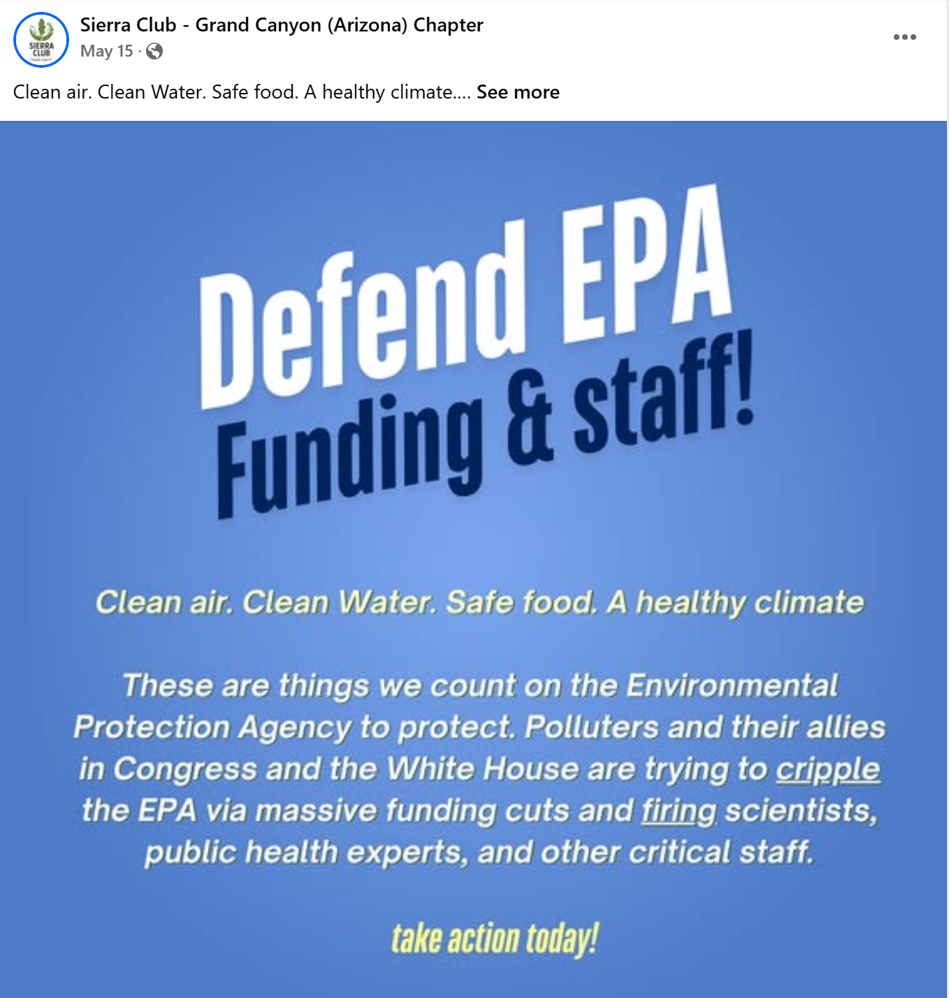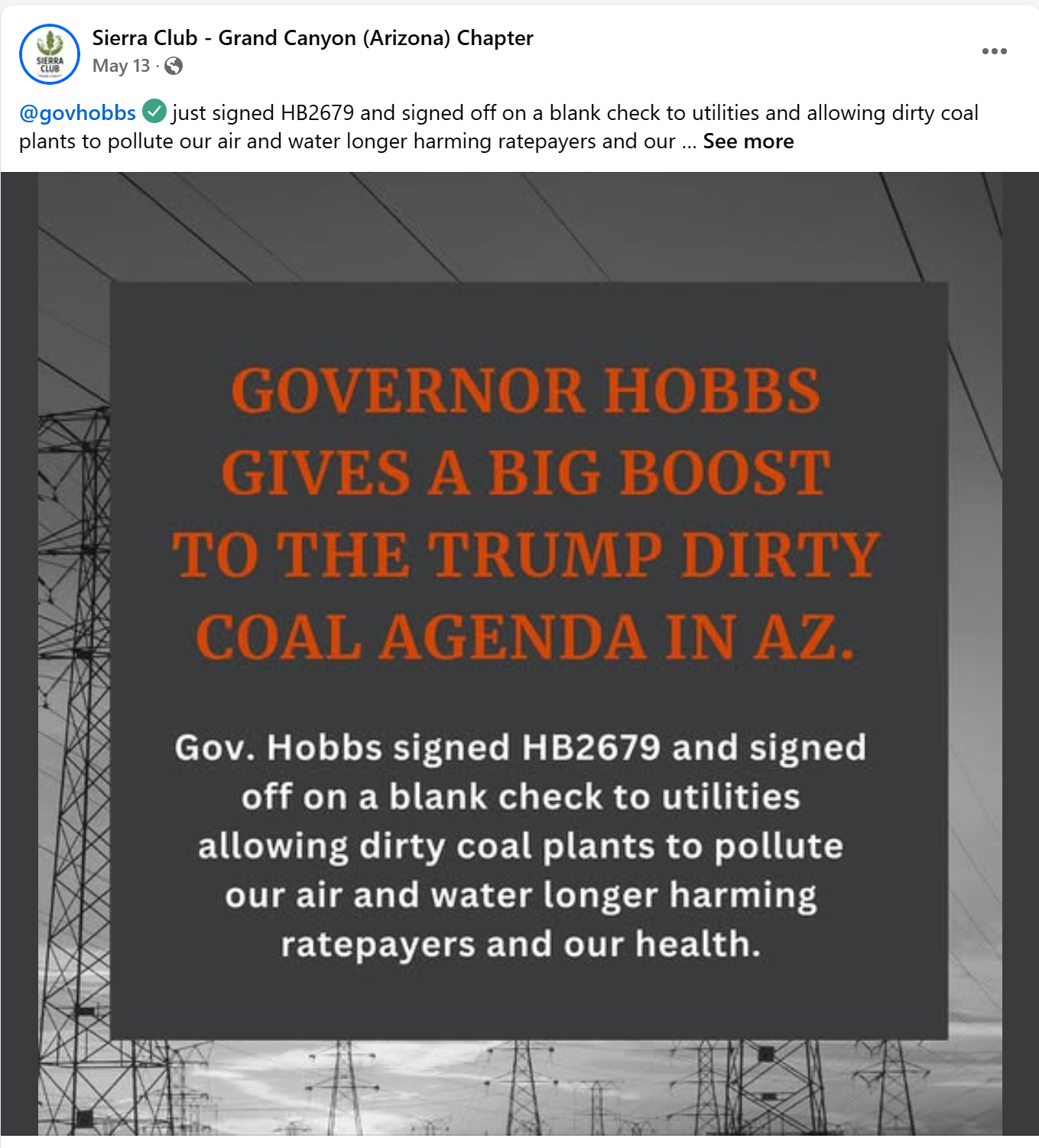 The Sierra Club Grand Canyon Chapter lists energy/climate change as a top policy issue area. The organization supports utility scale clean energy, energy efficiency, rooftop solar, municipal climate action plans and renewable energy mandates and subsidies. They oppose traditional energy sources like coal, natural gas and nuclear.