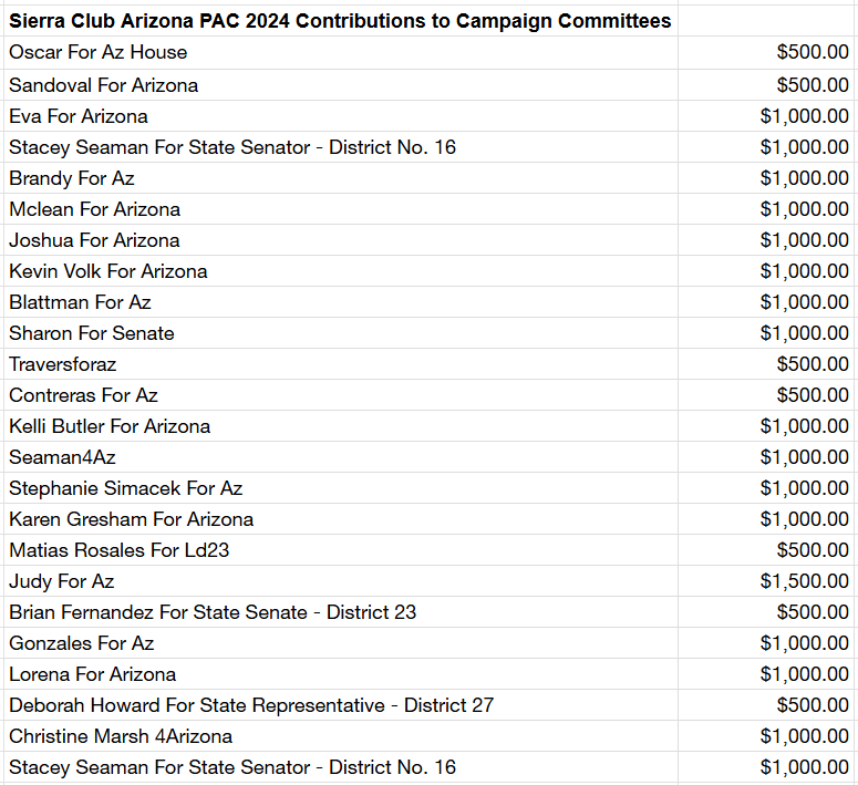 The Sierra Club Arizona PAC spent over $140,000 in AZ in the 2020 election cycle, and over $20,000 in the 2024 election cycle in contributions to campaign committees. In the 2020 and 2022 cycles combined they spent over $230,000 in Independent Expenditures. Below is a listing of the campaigns they have supported.