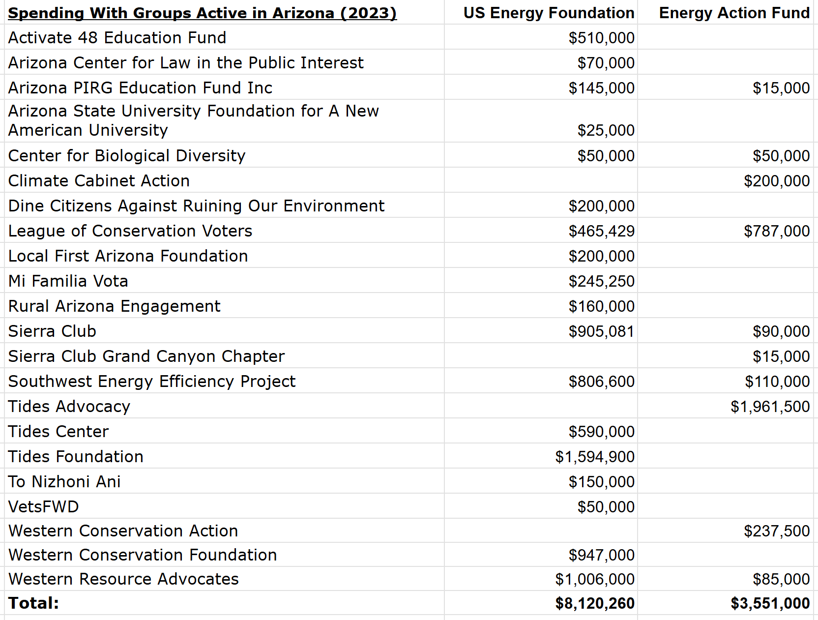 In 2023 (the most recent year for which we have data), the United States Energy Foundation and the Energy Action Fund spent a combined $11.6 Million with groups that are active in Arizona.